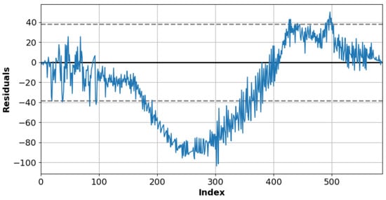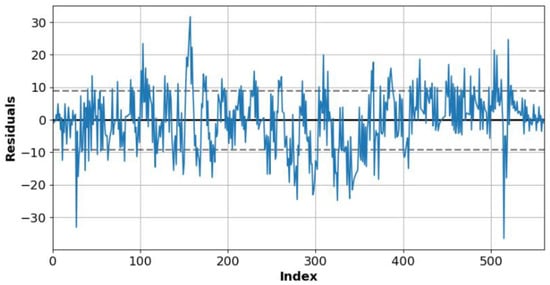 Table 2 presents the results of a quantitative evaluation of the test data for sunny and cloudy days. The sunny day data showed a MAPE of 4.58, which is lower than that of the cloudy day data, 7.06. In the cloudy day data, peak point errors occurred in the fluctuation amplitude according to the power production period, which increased the MAPE value compared to that of the sunny day data. The RMSE and MAE were lower in the cloudy day data, thus exhibiting more outstanding results. Figure 10 and Figure 11 plot the residuals between observed and forecasted values for the sunny and cloudy day test data. The dotted line indicates the standard deviation (SD) corresponding to the residuals.