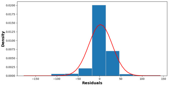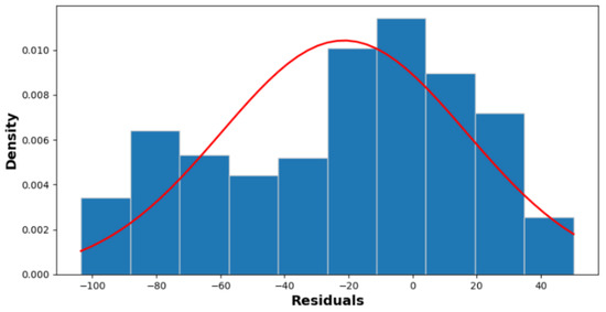 The forecasting model can generate errors in predicting the maximum power generation value. The error in the cloudy day data is 10.83 less than that for the sunny day data. The number of data deviating from the standard deviation section is less than the number of data used in the experiment. Figure 12 and Figure 13 show the frequency distribution of residuals with an SD of 38.25 and a mean of 34 for sunny days and an SD of 27.42 and a mean of 17.13 for cloudy days, respectively.