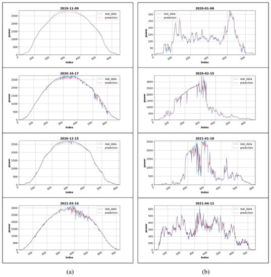 The advantage of the LSTM model is further highlighted when using unfavorable weather patterns. Figure 14a,b show the qualitative evaluation results of various test data for the sunny and cloudy day data, respectively. The proposed algorithm adequately follows the trends in various power generation patterns for accurate forecasting. However, errors occur at peak points for the cloudy data with irregular patterns and large fluctuations. However, the algorithm is robust to abrupt changes in the patterns and fluctuation periods, thus reasonably following the trend for reliable forecasting. A qualitative evaluation confirms the high efficiency and improved performance of the proposed model in solving the PV power generation forecasting problem.