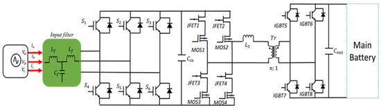 Krishnamoorthy et al. [65] proposed a matrix converter (AC to AC) for EV fast-charging applications, which does not require the traditional AC/DC/DC structure. The topology is presented in Figure 6. The front-end matrix converter converts the three-phase 50/60 Hz AC voltage to single-phase high-frequency AC voltage. The high-frequency transformer creates the galvanic isolation and the PWM rectifier rectifies the high-frequency AC voltage to DC voltage suitable for the battery. This topology ensures single-stage power conversion and removes the DC link capacitor at the output of the conventional AC-DC stage. Therefore, matrix converters usually achieve higher power density when compared to traditional two-stage solutions [66,67].