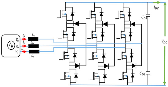 Although three-phase diode rectifier [20] (unidirectional topology) and 2-level active PWM rectifier [46] are the two most popular topologies for the AC-DC stage, several other topologies have been found in the literature, which reduces the filtering requirements at the PFC stage of the EV charger. For example, [62,63] proposed a three-level neutral-point clamped (NPC) phase-leg-based AC-DC converter topology, which is presented in Figure 5. Because of the three-level operation and the PWM modulation strategy, the topology can reduce the input filter size. Although the voltage rating of each semiconductor device is reduced, the number of semiconductor devices is doubled compared to the two-level active rectifier, which can reduce the power density of chargers greater than 10 kW.