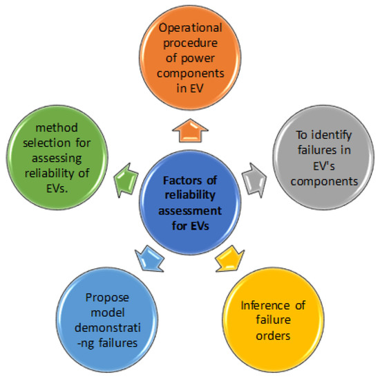 Power electronic converters fail for many reasons. For example, an increment in the on-state voltage during power cycling causes power losses that increase the temperature of the entire chip of the converter/inverter, which speeds up the bond wire lift-off via the generated stress through the thermal expansion mismatch between the wire bond and the chip [71]. In view of the developments in the field of Electric Vehicles (Evs), it is vital to assess the lifetime of Evs’ electrical components considering reliability in terms of service and maintenance. The significant factors concerning the reliability assessment of Evs that need to be considered are presented in Figure 7 [72,73,74].