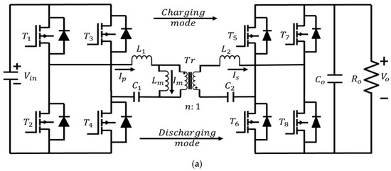 In [28], the DAB topology with the series-resonant converter (SRC) topology and two-stage series-resonant converter topology were compared for the DC-DC stage of the charger. It was found that the two-stage SRC was more efficient compared to the DAB topology. However, the analysis was shown for a 12 V battery charger (auxiliary charger) rather than the main battery charger of the vehicle. SRC and two-stage SRC topologies are shown in Figure 2 and Figure 3, respectively [47].