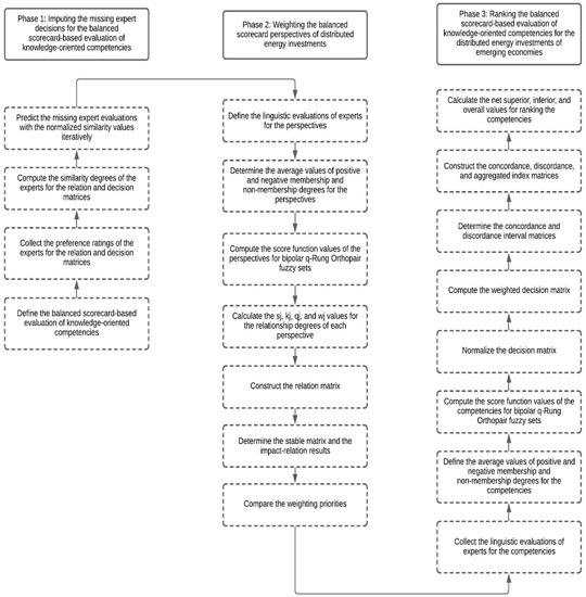 This study aims to identify significant knowledge-oriented competencies of distributed energy investments. For this purpose, a unique decision-making model is generated with three stages. Firstly, collaborative filtering is adapted to the decision-making methodology to input the incomplete evaluations of the decision-makers. Secondly, the extension of SWARA entitled M-SWARA with bipolar q-ROFSs and the golden ratio is applied to figure out the impact-relation directions and the criteria weights. In this context, the perspectives of the balanced scorecard are taken into consideration. Thirdly, the extension of ELECTRE entitled golden ratio bipolar q-ROF ELECTRE is used to generate the possible directions among the competencies of knowledge-oriented distributed energy investments. The details of the proposed model are indicated in Figure 1.
