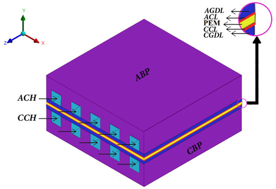 A PEMWE is made up of a membrane (PEM) sandwiched between two electrodes. The membrane divides the PEMWE into two parts called cathode and anode, which individually consist of a gas channel, a gas diffusion layer, and a catalyst layer. A schematic diagram of a typical PEMWE is shown in Figure 1. On the anode side, water enters the anode channel (ACH) and then passes through the porous gas diffusion layer (AGDL) to the anode catalyst layer (ACL) where water is split into protons, oxygen, and electrons as a result of semi-reactions of oxidation, as shown in Equation (1). Hydrogen protons pass through the membrane to the cathode catalyst layer (CCL), and electrons also migrate to the CCL via an external circuit. On the cathode side, hydrogen protons and electrons combine and produce hydrogen gas as a result of semi-reactions of a reduction, which is denoted by Equation (2). The overall reaction is presented in Equation (3).