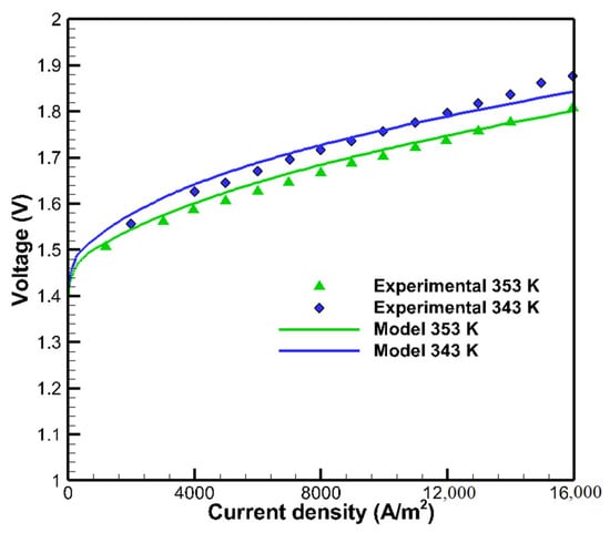 In order to validate the results of the simulation model, the numerical results are compared with the data of the experimental investigation presented by Millet [56]. The polarization curve predicted from the current model is compared to the polarization curve of the experimental study developed from [56] under the operating conditions of pressure at 1 bar and temperatures of 353 and 343 K, as given in Figure 3. The model predictions are in good agreement with the experimental results [56]. The maximum error in voltage measurements of the present model is equivalent to 0.02 and 0.0354 V at operating temperatures of 353 and 343 K, respectively, in comparison to the experiment data.
