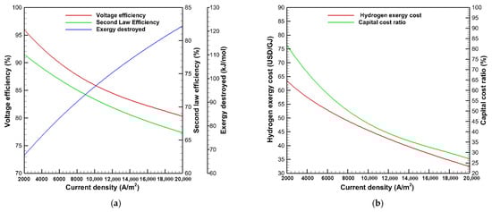Effects of current density on (a) voltage efficiency, exergy destroyed, second law efficiency, (b) hydrogen exergy cost, and capital cost ratio.