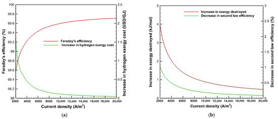 Effects of current density on; (a) Faraday’s efficiency, the increase in hydrogen exergy cost; (b) the increase in exergy destroyed, and the decrease in second law efficiency.