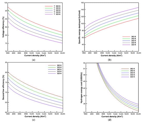 Effects of temperature on: (a) voltage efficiency; (b) exergy destroyed; (c) second law efficiency; and (d) hydrogen exergy cost.