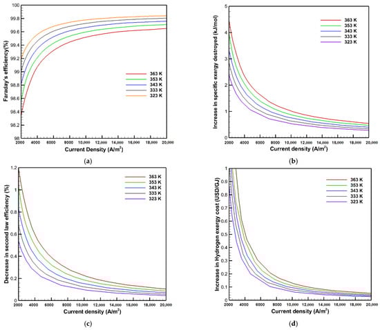 Effects of temperature on: (a) Faraday’s efficiency; (b) the increase in exergy destroyed; (c) the decrease in second law efficiency; and (d) the increase in hydrogen exergy cost.