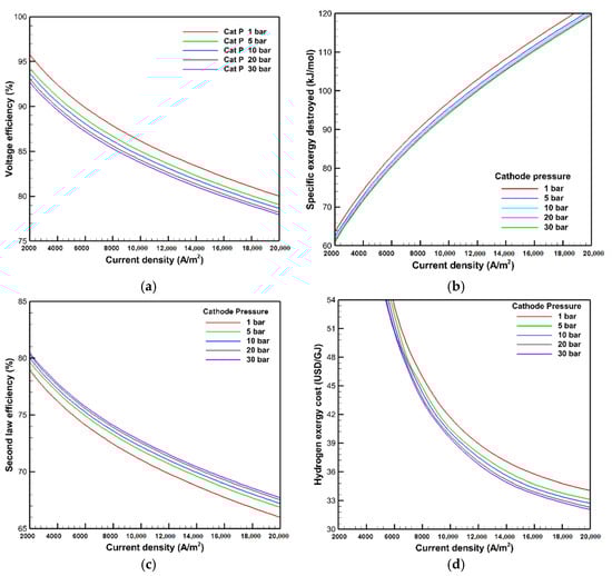 Consequently, the exergy destroyed is reduced at higher cathode pressure, and thereby, the second law efficiency is improved. The specific exergy destroyed is reduced by almost 3 kJ/mol at the current density of 15,000 A/m2 with the cathode pressure increasing from 1 to 30 bar, whereas the second law efficiency is improved by 1.7%, respectively. It is also found in Figure 8d that the hydrogen exergy costs are minimized by rising cathode pressure due to the low exergy destruction and high second law efficiency at high cathode pressure, where hydrogen exergy cost is diminished from 36.5 to 34.4 USD/GJ at the current density of 15,000 A/m2 with raising the cathode pressure from 1 to 30 bar, respectively.