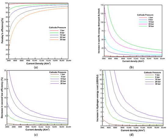 Effects of cathode pressure on: (a) Faraday’s efficiency; (b) the increase in exergy destroyed; (c) the decrease in second law efficiency; and (d) the increase in hydrogen exergy cost.