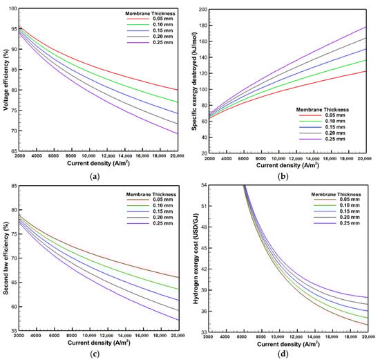 Effects of membrane thickness on: (a) voltage efficiency; (b) exergy destroyed; (c) second law efficiency; and (d) hydrogen exergy cost.