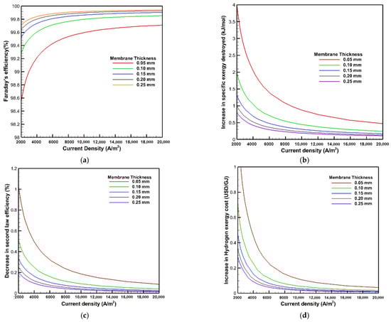 Effects of membrane thickness on: (a) Faraday’s efficiency; (b) the increase in exergy destroyed; (c) the decrease in second law efficiency; and (d) the increase in hydrogen exergy cost.