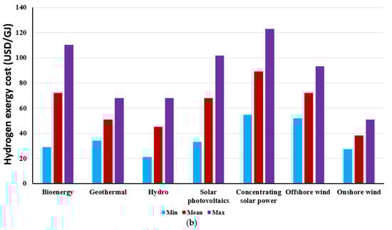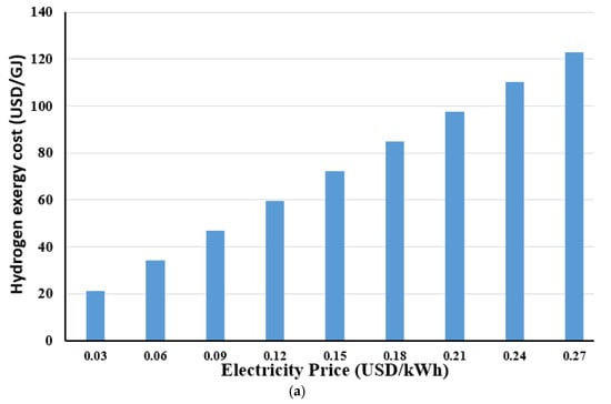 It is well known that the price of electricity varies among countries. Similarly, the price of electricity generated from different renewable energy resources also varies as well. The electricity price generated from various renewable energy resources, including bioenergy, geothermal, hydropower, solar photovoltaics, concentrating solar power, offshore wind energy, and onshore wind energy as stated by Lee et al. [58] is used in this paper. Therefore, this study could be appropriate for various countries and different renewable energy resources by observing the impact of different electricity prices on hydrogen cost. The effect of the electricity price on the hydrogen exergy cost for PEMWE is shown in Figure 12a under an operating current density, a temperature, and a pressure of 20,000 A/m2, 353 K, and 1 bar, respectively. The cost of hydrogen exergy increases by raising the electricity price since the electricity cost ratio to the overall cost is almost 73% at an electricity price of 0.06 USD/kWh. The growth in the hydrogen exergy cost is by about 4.23 USD/GJ for an electricity price increase of 0.01 USD/kWh at the current density of 20,000 A/m2, reflecting the significant impact of the electricity price on the cost of hydrogen production. With increasing the electricity price from 0.03 to 0.27 USD/kWh, the hydrogen exergy cost is raised from 21.4 to 123 USD/GJ, which corresponds to the rise in the hydrogen exergy cost from 0.077 to 0.44 USD/kWh. Figure 12b depicts the effect of electricity prices generated from various renewable energy resources on hydrogen exergy costs. The lowest price of renewable electricity has been achieved by employing onshore wind energy and hydropower. In contrast, the highest price for renewable electricity has been attained from concentrating solar power. Consequently, the maximum hydrogen exergy cost is achieved using concentrating solar power, whereas it is less costly using onshore wind and hydro. Therefore, it should be mentioned that it is essential to utilize the lowest possible electricity price to run the PEMWE, which intensively minimizes the cost of hydrogen production and improves the economic proficiency.