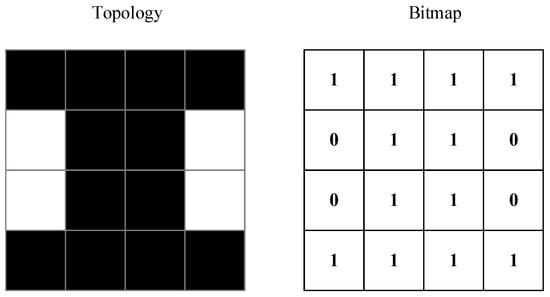 A broken feature only has some of the useful features and can lead to poor convergence characteristics. Therefore, 2D encoding became an alternative solution for certain problems. A demonstration of 2D encoded topology is shown in Figure 2. The bitmap matrix only has 0 and 1 values, a binary-encoded bitmap.