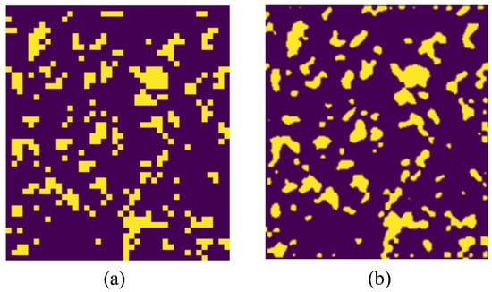 A demonstration of a bitmap using 2D interpolation with the contour parameter c = 0.5. (a) original topology (40 × 46), (b) interpolated topology (200 × 230).