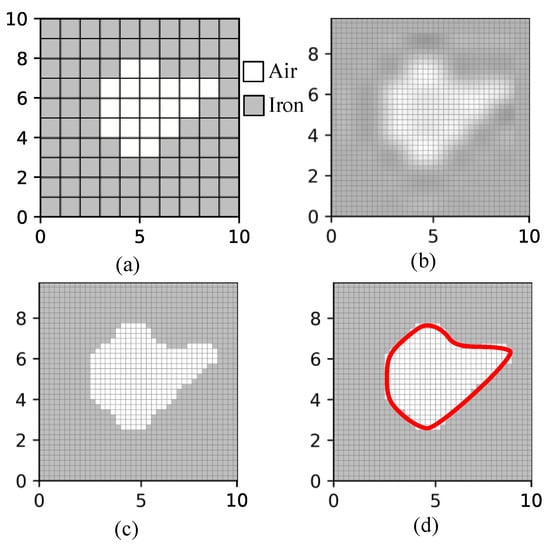 The overall process of high-resolution interpolation and edge smoothing method. (a) is binary encoded topology (10 × 10) for genetic algorithm, (b) is interpolated bitmap topology (50 × 50), (c) is smoothed edge based on using suitable density threshold, i.e., 0.5 in this figure, and (d) is the vectorized boundary (closed curve in red) for FE model.