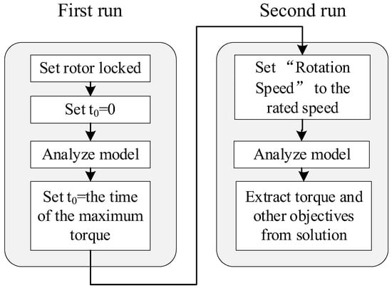 As stated in previous sections, the MTPA control strategy is suitable for IPMSMs to generate the largest torque with stator armature currents with a constant magnitude. In the machine optimization process, the maximum value of output torque and minimum value of torque ripple are usually taken as the objectives. Therefore, it is necessary to perform the simulation in two steps. Figure 7 shows the workflow for the two-stage simulation during the MOGA.