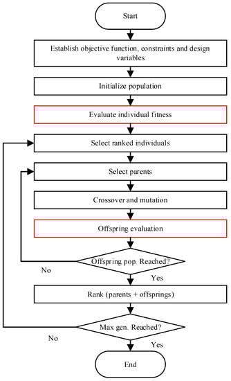 The population with a high ranking is reproduced in the next generation. We adopted 2D binary crossover and 2D binary mutation to produce a diversified population. The number of populations and generations are 40 and 250, respectively. The crossover factor is 0.9, and the mutation factor is 0.1. The optimization process is shown in the flowchart in Figure 9.