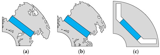 Selected optimized rotor topologies and the reference model. (a) is Model 0, the is 2.41 Nm, and the is 0.38 Nm. (b) is Model 1, the is 2.57 Nm, and the torque ripple is 0.85 Nm. (c) is the reference model, the is 1.83 Nm, and is 0.53 Nm.
