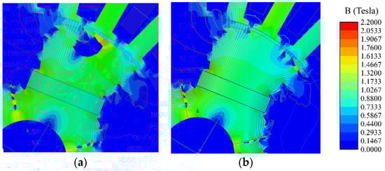 Figure 13 shows the flux density distribution and flux lines of the two selected optimized raw designs. According to the topology optimization, the design domain of low flux density has been deleted to meet the requirement of the constraints for higher torque and lower torque ripple. Model 0 forms a hole or a flux barrier in the rotor, and the torque ripple of model 0 is smaller than model 1.