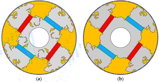 The whole model of the selected topology optimized AIPMSM rotors. The yellow parts are filled with resin epoxy, and a carbon fiber sleeve protects the whole rotor. (a) is the original model 0, the torque is 2.419 Nm, and the torque ripple is 0.308 Nm; (b) is the simplified model 0, the torque is 2.452 Nm, and the ripple is 0.366 Nm.