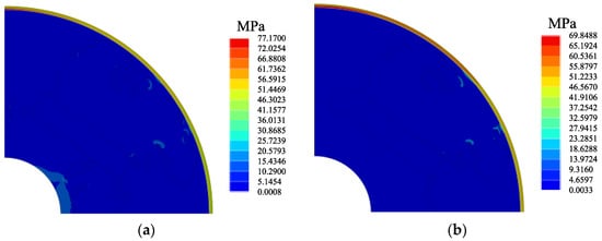 The von Mises stress distributions at 3600 rpm for topology-optimized AIPMSM rotors, (a) is distribution of the original selected model 0, and the maximum von Mises stress is 77.1700 MPa, and (b) is the distribution of the simplified model, and the maximum von Mises stress is 69.8488 MPa.
