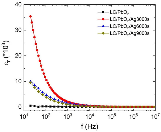 The dielectric constant of LC\PbO2, LC\PbO2\Ag for 3000 s, LC\PbO2\Ag for 6000 s, and LC\PbO2\Ag for 9000 s.