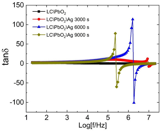 The dielectric loss tangent of LC\PbO2, LC\PbO2\Ag3000s, LC\PbO2\Ag6000s, and LC\PbO2\Ag9000s samples.