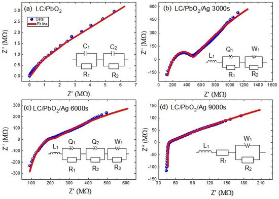 The Nyquist plot of LC/PbO2/3000s shows two semicircular arcs: a large one at low frequencies and a small one at higher frequencies. Moreover, a peculiar feature is the smaller arc subtending to negative values at higher frequencies. The theoretical modeling of the plot is accomplished by an equivalent electrical circuit, which consists of an inductor connected in series to two parallel circuits. Equation (2) is the corresponding mathematical form of the circuit. One parallel circuit consists of a constant phase element (CPE) and a resistor, while the other one consists of a Warburg element (W) and a resistor. The inductor accounts for the negative arc at high frequencies, and the parallel circuit with CPE represents the smaller arc at high frequencies, while the parallel circuit containing the Warburg element represents the straight-line-like behavior at lower frequencies. The high-frequency, inductor-like behavior is already displayed in the dielectric loss and was explained accordingly. The middle frequency relaxation behavior is modeled with a leaky capacitor (CPE) and a parallel resistor. At low frequencies, the Warburg element represents the diffusion behavior of charges. A general rule for these scenarios is that whenever there is a straight line in the Nyquist plot with an inclination of 45° with the x-axis, it represents diffusion. The Warburg element is a manifestation of Fick’s law of diffusion [41]. In our case, the graph line is a little bent toward the resistance line, which is due to the parallel combination of resistance and Warburg as shown in the fitted circuit [41]. Since the Ag is deposited on the surface, some portion of it goes through the samples due to voids and pores in the sample. This adjustment of the Ag inside the sample gives rise to conductive paths. Fick’s first law states that the overall density of ion flow in the system is the sum of ion diffusion and ion conductivity. Conductive paths through the polymer sheets are not fully developed at lower coating times. Thus, the only way for ion transport is diffusion, which occurs due to the chemical potential differences along the path. Therefore, at low frequencies, the charges may diffuse into the pores and voids in the direction of the applied field, a behavior similar to DC current flow. The modelled parameters for this sample are given in Table 2.