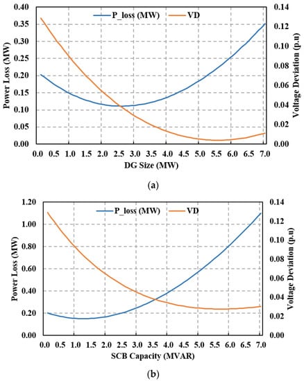 Impact of DG/SCB size on the power loss and voltage deviation in the distribution network; (a) for DG, (b) for SCB.
