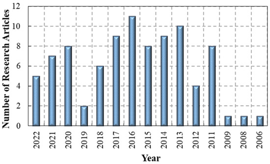 This section presents the method used in selecting published literature on the performance optimization of distribution networks by simultaneous DGs and SCBs allocation. It is essential to segregate what has been done previously and highlight future research areas. For this comprehensive review, priority is given to peer-reviewed articles published in reputed journals and conference papers. The major online services, namely, Google Scholar (https://scholar.google.com/), Science Direct (http://www.sciencedirect.com/), IEEE Xplore digital library (https://ieeexplore.ieee.org/), and Web of Science (http://webofknowledge.com/) were used. The searched keywords were; “Optimal simultaneous DG and SCB allocation in distribution networks”, “distributed generation and shunt capacitor allocation”, “optimal combined placement of DGs and SCs”, “optimal sizing and siting of DGs and SCBs”, “concurrent distribution generation and capacitors allocation”, and “simultaneous distributed generation and capacitor banks placement in distribution networks”. This paper presents the critical review of ninety (90) research articles pertinent to the subject area and published from 2006–2022. The yearly frequency of research papers is presented in Figure 3, which has been published per the current literature review. More than 1000 articles are available in the literature on the optimal allocation of DG or SCB units in distribution networks. However, the key focus of studies selected for this review is on the combined DG and SCB allocation or the optimal allocation of one prior existence of other elements at some fixed point of the distribution network. Few studies have incorporated voltage regulator (VR), thyristor controlled series capacitor (TCSC), and network reconfiguration as an additional constituent of DG–SCB mix.