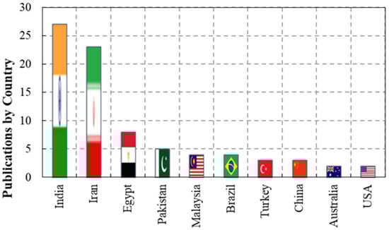 Countries with the most publications in the field of simultaneous DG-SCB allocation in distribution networks.