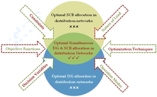 In the past few years, the combined DG and SCB allocation have exposed their performance dominance over the sole implication [50]. Therefore, the integrated approach of DGs and SCBs in the distribution system is receiving significant attention from researchers and engineers due to their collective effect on technical and financial benefits. For this reason, this review paper covers research studies explicitly conducted in the area of simultaneous DG and SCB allocation in the distribution system.