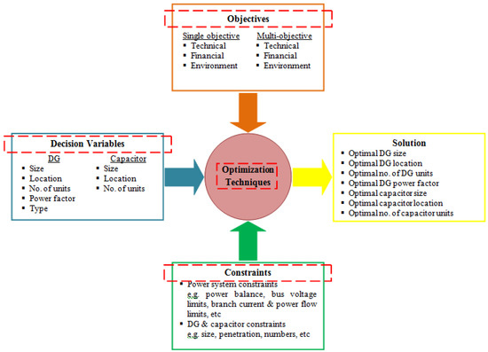 The optimal DG and SCB allocation planning for any electrical network involves several key factors. These factors include research objectives (goals to achieve), optimization techniques (algorithms), constraints (physical limits of the power system), and decision variables (quantity to be controlled), as shown in Figure 7. Optimization is making the best or most effective use of a resource or situation. The key criterion for the optimal simultaneous DG and SCB allocation in the distribution networks is to ensure the efficient, environment-friendly, secure, and quality supply for the consumers with minimum use of resources. This can be accomplished by selecting the appropriate sizes, placements, types, and quantities of DGs and SCBs. The optimization problem is dealt with concerning certain technical constraints that imitate the security criteria of the system. In-depth reviews of above described four elements are presented in the coming sections.