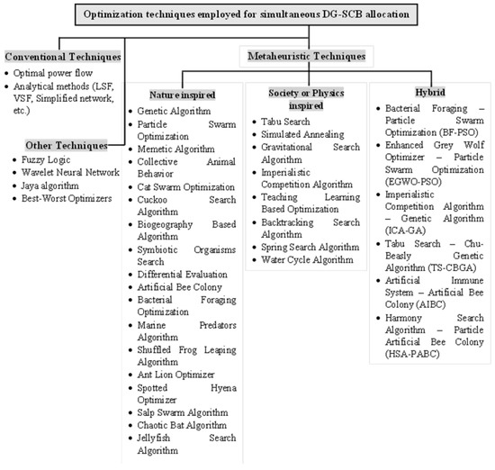 The research on optimal DG-SCB allocation is predominately conducted with metaheuristic techniques. These methods are very promising in solving complex optimization problems in diversified fields. The most interesting characteristic of a metaheuristic is that it does not require a deep understanding of the optimization problem to be solved [92]. Metaheuristic algorithms are approximation methods as they cannot always obtain the optimal global solution. Moreover, the metaheuristic techniques can be categorized into nature-inspired, physics or society-inspired, and hybrid algorithms.