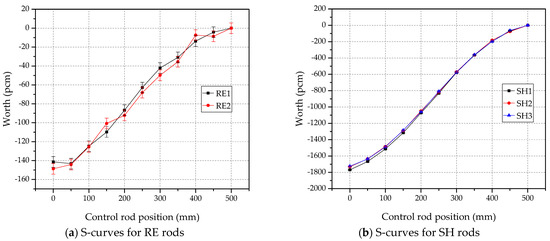 The estimated S-curves from McCARD MC simulation are plotted in Figure 2. In the MC calculations, the S-curves were obtained by calculating the control rod worth at multiple axial position; a single control rod was inserted from 500 mm (the top of the active core) to 0 mm (the bottom of the active core) at a step size of 50 mm while the others were fully withdrawn. Note that the McCARD MC simulations were conducted under the condition of 100,000 histories/generation with 50 inactive and 250 active generations. The uncertainty of criticality was estimated to be about 4 pcm with the stated conditions. Because of the small rod worth of the RE rods, the statistical uncertainty hindered obtaining smooth S-curves, as plotted in Figure 2a, while relatively smooth S-curves were obtained for the SH rods, as in Figure 2b.