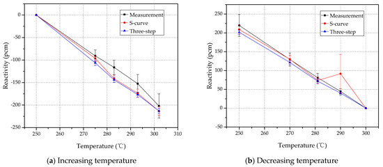 The temperature reactivity results are listed in Table 4, and a visual comparison is plotted in Figure 4. The largest error in the increasing process was observed at 283 °C, which is slightly greater than the uncertainty of the relative error, while other results showed a suitable agreement with the measurements. The three-step results showed a similar error behavior as the results from the S-curve approach, but the former had a slightly greater error. In the decreasing process, on the other hand, a very large error was observed at 290 °C, as expected from the extremely large estimated uncertainty. Except for the reactivity at 290 °C, a relatively small error was observed in the McCARD results with S-curves as the SH rod positions returned to the reference positions. Therefore, the measurement at 290 °C should be excluded from the analysis since the sudden change in control rod positions made the calculation results unreliable.