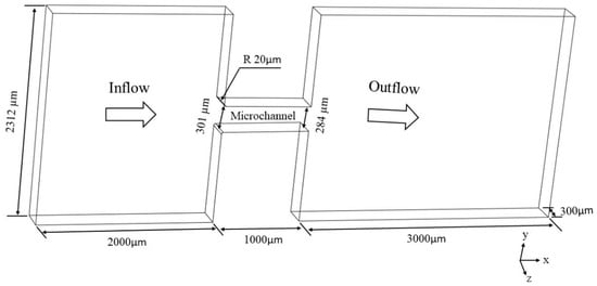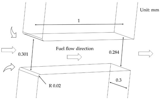 In this paper, a “U” shaped pipe from the Winklhofer visualization fuel experiment [] was selected as the object of our study, and its geometry is shown in Figure 1. The geometrical parameters of the “U” pipe model are: pipe thickness , microchannel inlet height , microchannel outlet height , microchannel length , and microchannel inlet corner radius . The previous studies [,,] all used microchannel models with additional preset buffer flow channels to verify with the Winklhofer test results for comparison. The purpose was to keep the inlet and outlet pressures of the microchannel in the simulation consistent with the pressure conditions in the test so that the simulation results are closer to the actual test measurements. As shown in Figure 2, the simulation model of Guan [] is referred to in this paper, and the buffered flow channels of × × and × × are preset before and after the microchannel model, respectively.