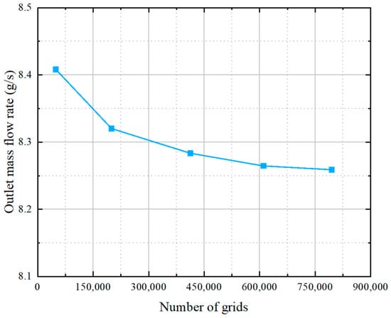 For the above-mentioned grid division strategy, the grid irrelevance was verified by using the grids of magnitude 50,000, 200,000, 400,000, 600,000 and 800,000 in turn. The Winklhofer flow experiment was able to observe the supercavitation phenomenon in the microchannel under the condition of 80 bar differential inlet and outlet pressure. Therefore, the grid-independent verification is based on the above pressure conditions, and the mass flow rate at the exit of the microchannel for five grid numbers is shown in Figure 4. The results show that the mass flow rate at the exit of the microchannel tended to a stable value when the number of grids exceeded 600,000. Considering the accuracy of subsequent numerical calculations and the allocation of computational resources, we finally determined that the grid number of the computational model was 600,000, in which the minimum grid size at the near-wall surface was 0.5 μm and the maximum grid size at the central flow channel was about 4 μm.