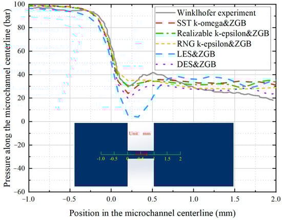 Figure 5 illustrates the differences in pressure gradient profile changes for multiple turbulence and cavitation model applications. The pressure gradient curves obtained from different model combinations almost overlap and are similar to the experimental results as the fuel flows from the upstream buffer basin to the vicinity of the microchannel inlet. As the fuel flows through the cavitation and non-cavitation regions, all five model combinations, except for the RNG k-ε and ZGB model combinations, show a trend where the pressure value first drops to a minimal value, then rises, and finally decreases. The errors between the pressure gradient results of the five models and the experimental data in each zone are given in Table 3. As can be seen from Table 3, except for the model combinations of LES and ZGB, the results obtained in the two zones of −1.00~−0.25 mm and −0.25~0.22 mm are close to the experimental data, and the errors are within 6%. In the 0.22–0.50 mm range, the best simulation results were obtained for the RNG k-ε and ZGB model combination with an error within 6%; in the 0.50–2.00 mm range, the simulation results for the RNG k-ε and ZGB, DES and ZGB model combinations were within 4% error. In general, the error between the pressure gradient simulation results obtained from the combination of RNG k-ε and ZGB models and the experimental data is the smallest. From Equation (9), it can be seen that the RNG k-ε model is based on the Standard k-ε model with the addition of terms that can improve the accuracy for fast strain flow []. Therefore, the RNG k-ε model shows superior simulation performance in the two main zones of fast strain flow in microchannels, −0.25 to 0.22 mm and 0.22 to 0.50 mm.