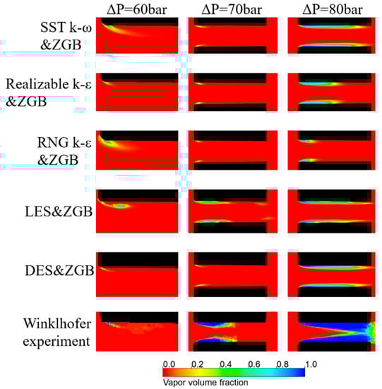 In summary, the cavitation domain attached to the microchannel wall developed as the ΔP between inlet and outlet increased, gradually extending along the wall to the outlet of the channel. The reason for the variability in the cavitation distribution between different model combinations at the same inlet and outlet pressure difference was the difference in the mathematical formulation of the different turbulence models because the cavitation domain was mainly composed of multiple large vortices clustered at the macroscopic level (one can see the wake of the vortices attached from the wall in the cavitation cloud at 60 bar pressure difference from the Winklhofer experiment). The above error analysis process also reflects that the LES model directly resolves the large vortices in a more suitable way for the simulation calculation of the cavitation domain than the way the remaining four turbulence models deal with the flow.