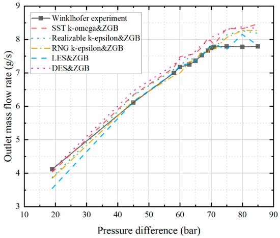 - For the numerical calculation of the outlet mass flow rate, all five model combinations can obtain numerical results in the range of pressure difference from 19 bar to 70 bar, in good agreement with the experimental data. After the differential pressure exceeds 70 bar, the calculation results of the remaining four model combinations can reflect the trend of the experimental data, except for the SST - and ZGB model combinations. Among them, the LES and ZGB model combinations have the best simulation results, and the errors in both study sections are within 2%.