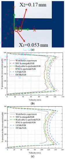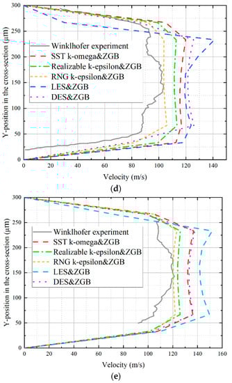 Combined with Figure 8c,e, the results obtained from the combination of the five models all match the trend of the test data at section x1 under the 67 bar ΔP condition, but this still makes it difficult to reproduce the flow velocity distribution in the range of about 50–100 μm away from the wall at x2. As can be seen from Table 6 and Table 8, the computational error of the flow velocity distribution near the wall at the 67 bar ΔP condition is slightly improved compared to that at the 55 bar ΔP condition. However, the simulation results are still somewhat different from the experimental data. For the central basin of cross-sections x1 and x2, the calculation errors of RNG - and ZGB models are still the smallest, i.e., the calculation errors at both cross-sections are within 8%. In contrast, DES and ZGB have the largest computational errors, which exceed 19% in both cross-sections.