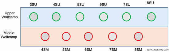 The Wolfcamp Formation in the Midland Basin consists of carbonate, evaporite, siliciclastic materials, lime mudstone, and dark shale [19,20]. Large amounts of organic materials that were accumulated in the Midland Basin during the early sedimentation period were later converted to oil and gas. Core sample analysis indicates that the Wolfcamp Formation in the Midland Basin has total organic carbon (TOC) of up to 8.7%, indicating high potential for oil and gas generation [21,22].