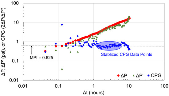 MPI estimated from the stabilized CPG: red solid circle represents the pressure difference between pressure build-up of Wwell 3SU and the predicted power law trend line at time after shut-in of Well 4SU; green solid triangle represents the derivative of at time ; blue solid diamond represents the at time (modified from [23]).
