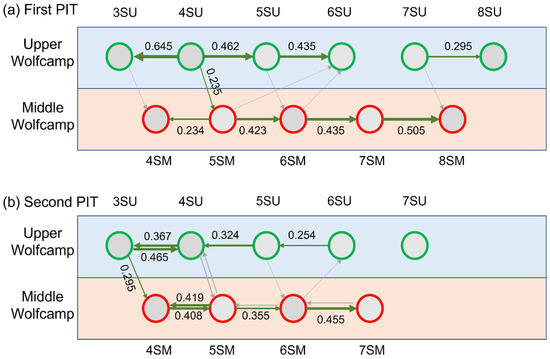 Pressure interference detected during the first (a) and second (b) pressure interference tests (PITs) at the HFTS-1-Midland site. Green arrows with MPI values on the side show measurable pressure interference. Gray arrows represent non-measurable pressure interference. The direction of all the arrows is from the monitored well to the observation well. The second PIT results for Wells 8SU and 8SM were missing (modified from [23]).
