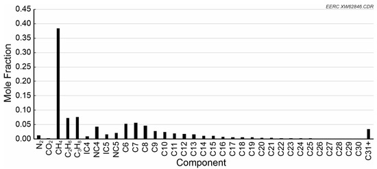 Crude oil collected from Well 6SU was used to measure pressure, volume, and temperature (PVT) data. The oil was relatively light, as 82.9 mol % of the components were hydrocarbons below decane (C10) and 53.2 mol % of the components were gas components, including C1 (methane), C2 (ethane), and C3 (propane), as shown in Figure 4.