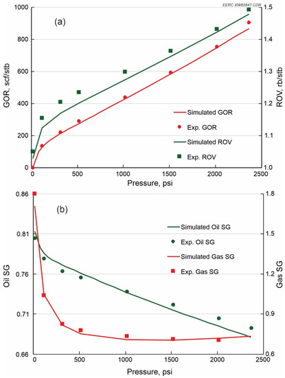 Simulated data (green or red lines) and experimental data (green or red symbols) comparisons for the 10-component EOS model: (a) gas/oil ratio (GOR) and relative oil volume (ROV) and (b) oil and gas specific gravity (SG). Gas SG is the ratio of the density of the gas to the density of air at 1 atm pressure at 60 °F. Oil SG is the ratio of the oil’s density to that of water at 60 °F.